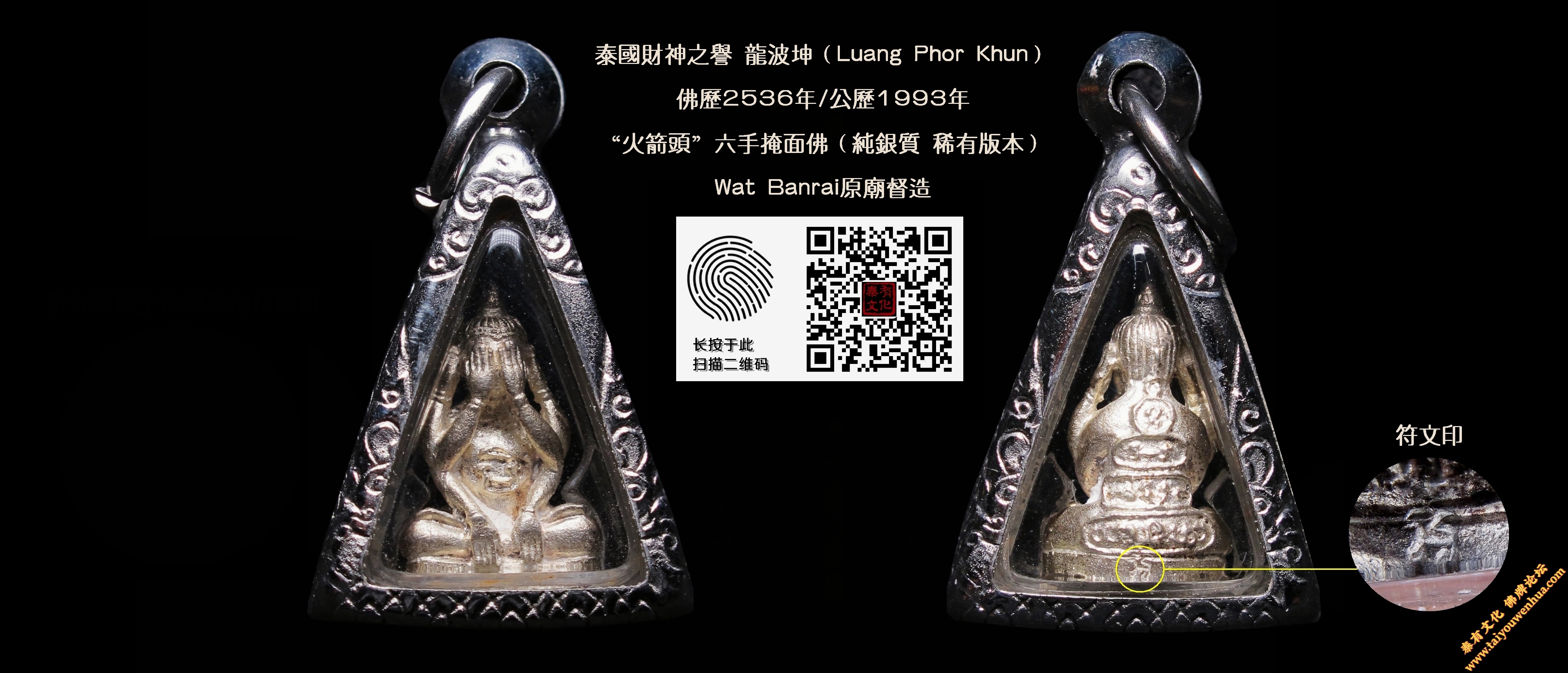 龙波坤/冠(LP Khun),有泰国财神之誉,泰国近代招财法门最顶尖的代表高僧,大慈善高僧捐款超过30亿泰铢,修为不必多言,相信大家都有所耳闻,佛历2536-2537年/公历1993-1994年,二期六手掩面必打佛,共有三种材质版本:纯金、纯银、九宝铜,此为纯银材质,属稀有版本,年份之所以横跨一个年度是因此期六手掩面必打历经两次加持,一次为佛历2536年督造完成后师傅加持五个月之久,二次为佛历2537年4月30日与代号百万必打佛同期法会再次加持,佛牌为小立尊造像,正面留有师傅生前亲点加持经粉,背有师傅独创的招财古巴利符文,下端打有防伪印记,前两年这期掩面被佛牌商炒到很高的价格,此牌收自4年前留存至今,恭金放到现在非常合适。 具备:助正偏财运、成就事业、兴旺生意、清还债务的效力,拥有三宝:佛、法、僧圆满之意及强大庇护的加持力量,泰有文化只出原年原版之真品圣物,待主。 |