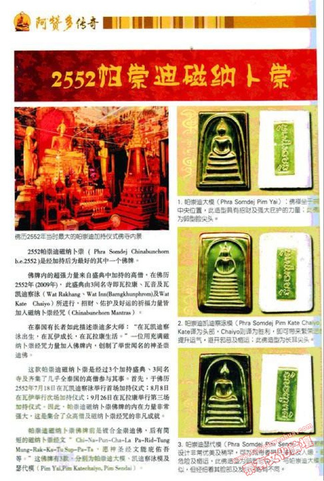 泰国三大著名崇迪寺廟,瓦音Wat Inn佛历2552年帕崇迪佛大模:纯银面罩的限量版本,背镶纯银崇迪短咒经文符片,原版独立编号。此期崇迪经过3个加持盛典、3间名寺及齐集了几乎全泰国的高僧参与加持:第一次于佛历2552年7月18日在瓦凯迪察泳举行首场加持仪式;8月8日在瓦音举行次场加持仪式;9月26日在瓦拉康举行第三场加持仪式,这是集合了众高僧及磁纳卜崇经咒(崇迪短咒)的非凡成就。